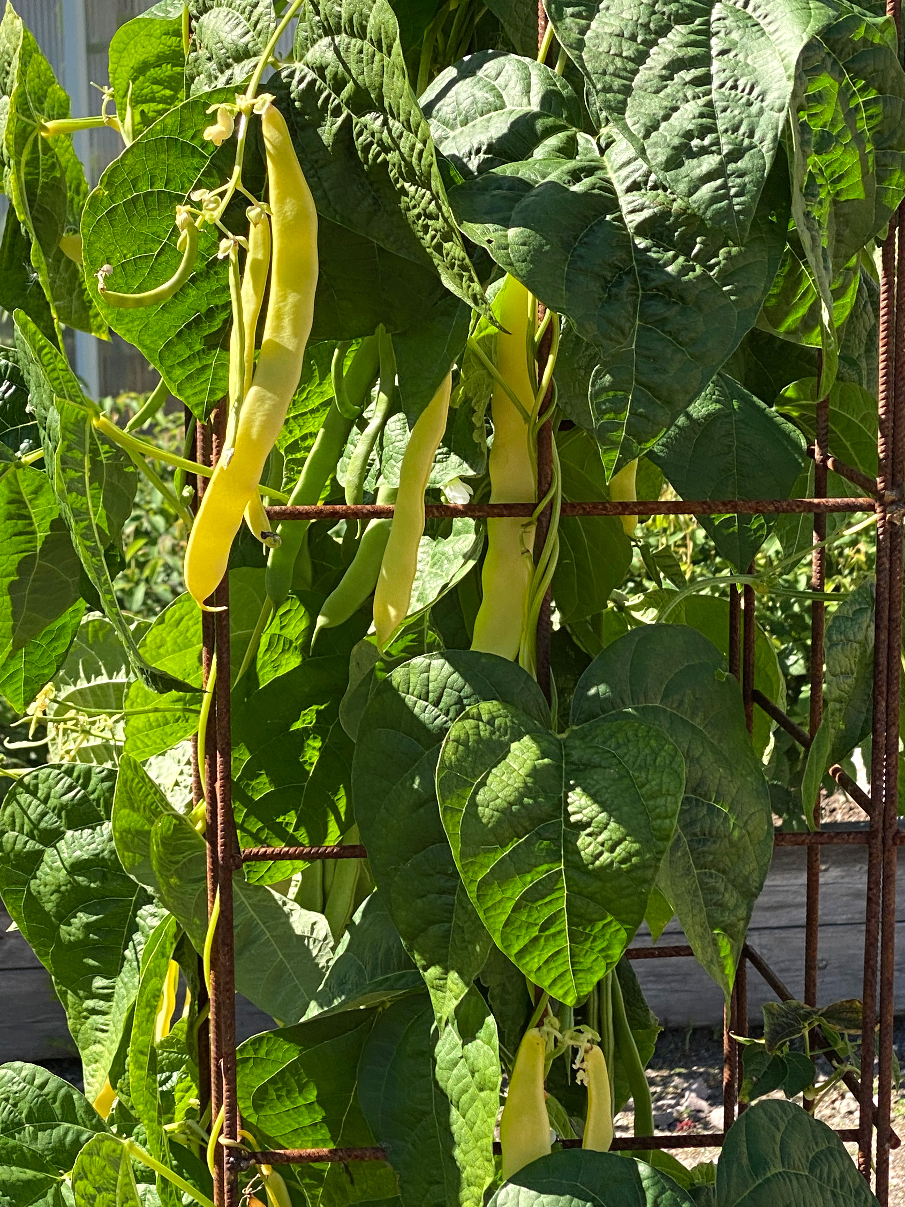 Det är alltid en njutning att se dessa långa, ljusgula baljor hängande i perfekt plockhöjd. De är dessutom några av de mest välsmakande bland störbönorna. Den mjälla baljan är plattrund, cirka 2–2,5 cm bred och bildar inga trådar eller membran. Den kan bli 22–24 cm lång, men är som mest delikat om den skördas vid 16–18 cm. Plantan slingrar sig lätt upp över två meter och behöver ett stadigt stöd i form av störar eller högväxande solrosor.