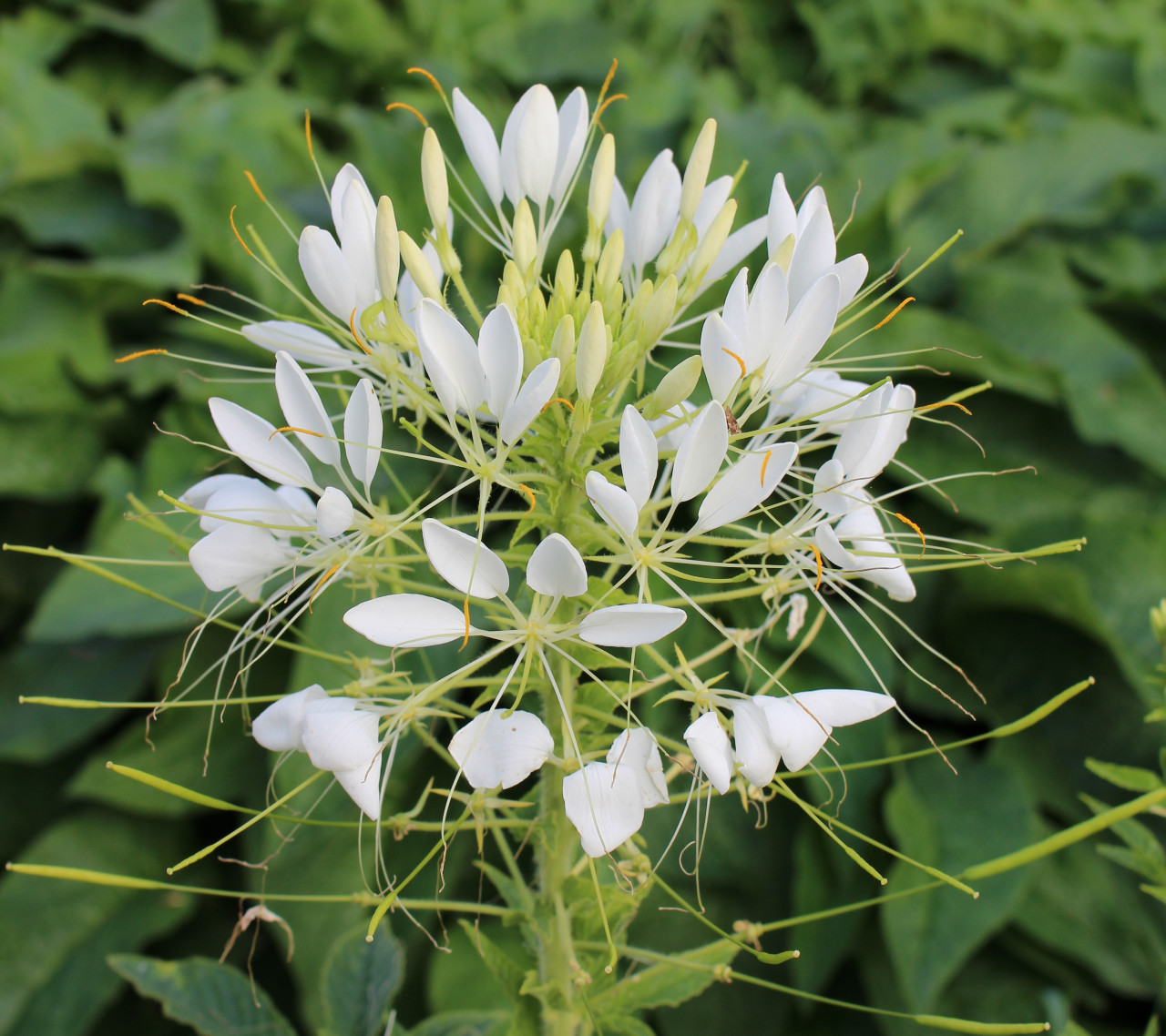 Paradisblomster med vita blommor. Tillhör familjen Cleomaceae som härstammar från Sydamerika. Passar bra både som solitär och i grupp med sitt ståtliga och luftigt gracila växtsätt. Blommorna sitter i stora, elegant spretiga klasar. Plantan växer snabbt och blir 80-150 cm hög och behöver oftast stöd. Paradisblomster trivs bäst i en väldränerad, näringsrik jord på en solig och luftig plats.