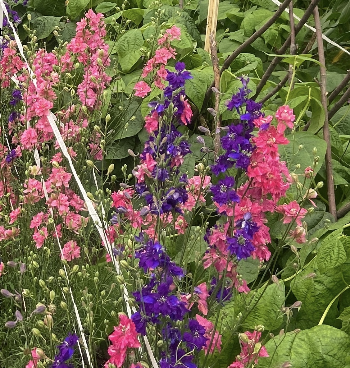 Höga slanka stjälkar, översållade med blommor i lila och rosa nyanser. Synonym Consolida ajacis.