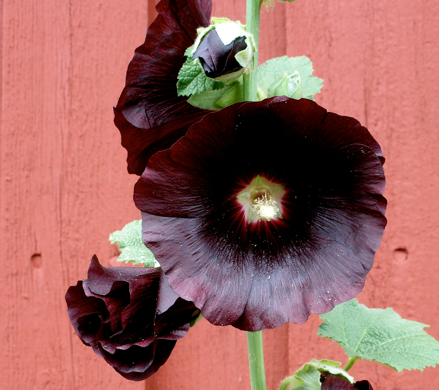 Alcea rosea. Djupt mörkviolett stockros med enkla blommor. De används som ett naturligt färgämne och ger en underbar färg åt bl.a. örttéer. Precis som hos vanlig stockros har också den "svarta" sin givna plats bland örtmedicinerna.
