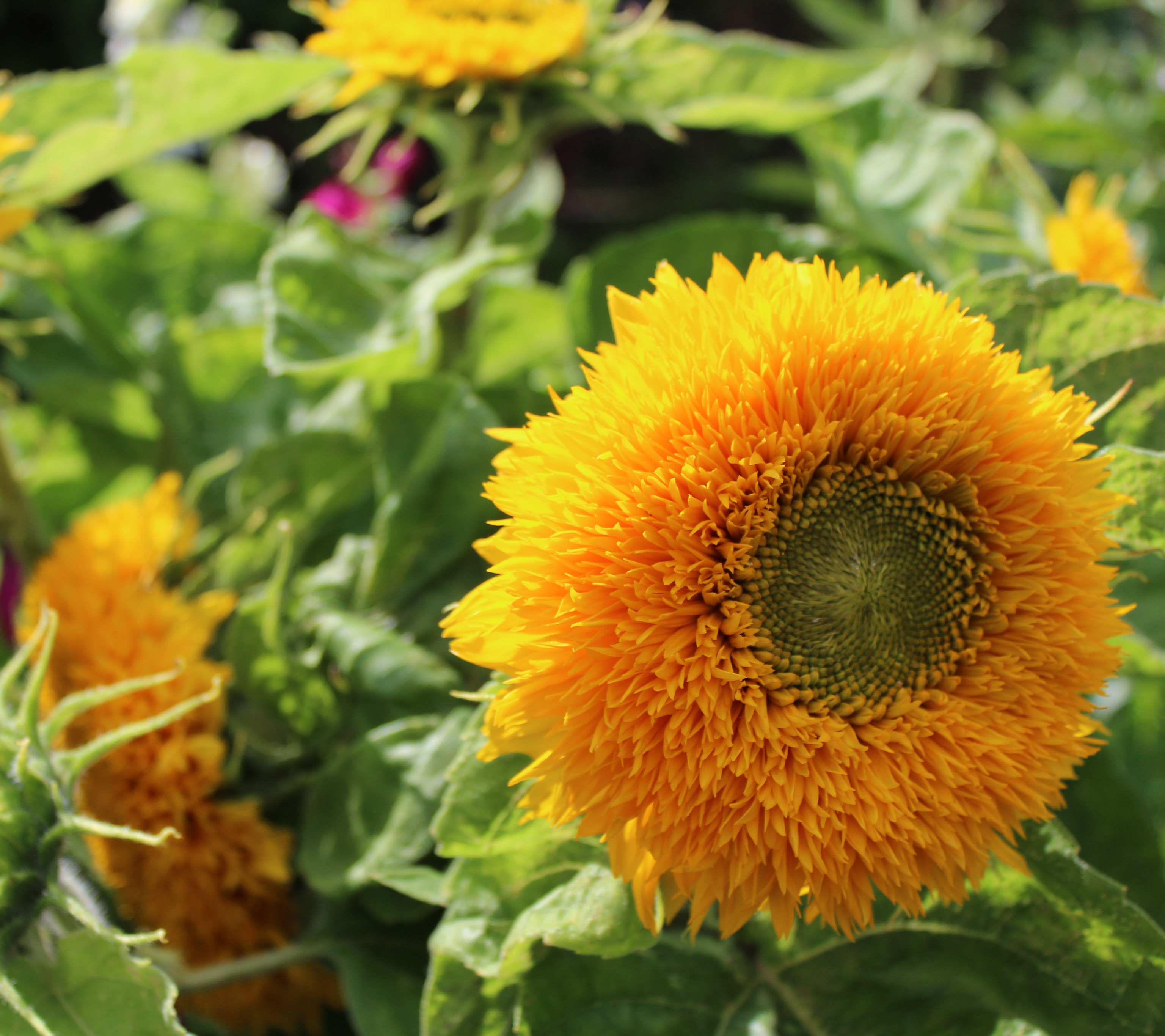 En lågväxande solros med guloranga, fyllda blommor som blir ca 10 cm i diameter. Sungold blir bara 50-60 cm hög och kan växa ganska tätt, 15-20 cm. De är kraftiga och stadiga och står i full blom länge.