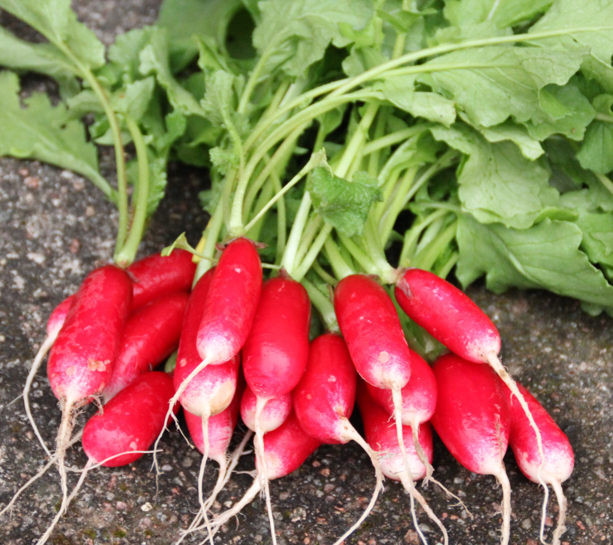 En mycket fin, avlång, rosenröd rädisa med vit nederdel. Den har ett milt och sprött kött av bästa kvalitet. French Breakfast, som är en av våra favoriter, växer ytligt och har liten blast. Kan ofta skördas först, men låt den inte förväxa. Roten blir lätt svampig i mitten då. Den fanns i fröhandeln redan 1885. Hette tidigare Raphanus sativus.
