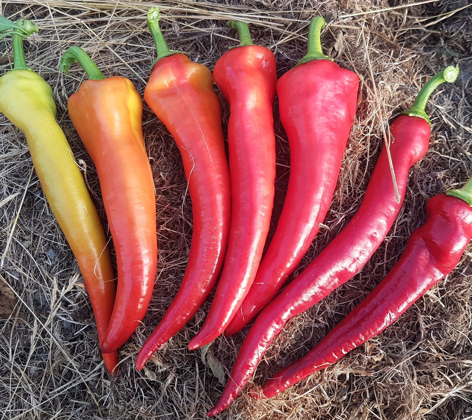 Frukterna skördas ibland gröna, men är inte helt mogna förrän färgen skiftat till rött. Eller till gult, orange och brunt för en del sorter. Plantan sätter ny frukt så länge den skördas.Frö