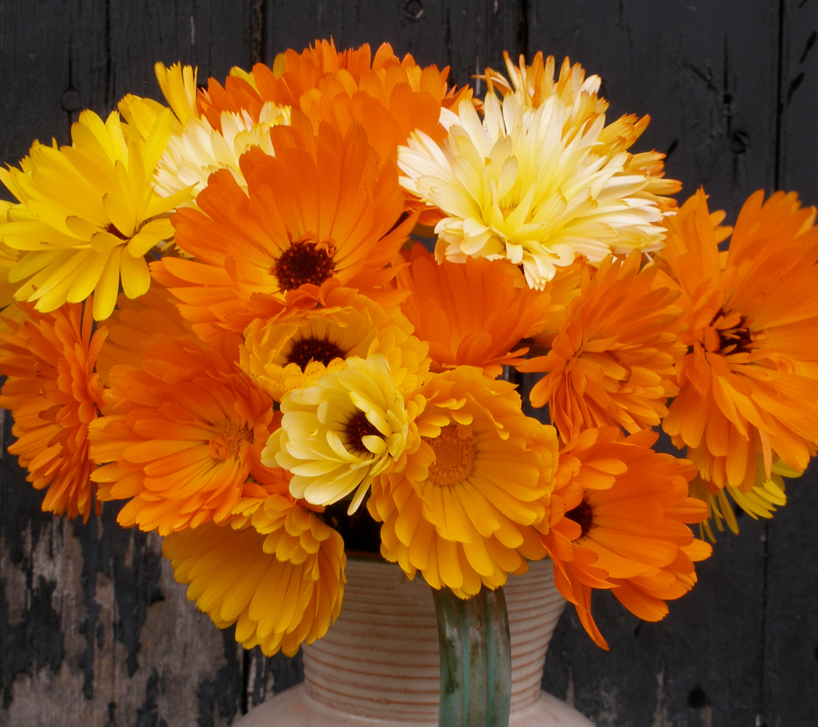 Ringblomma med blandade färger i orange och gult. Enkla och halvdubbla blommor. Höjd 60cm.