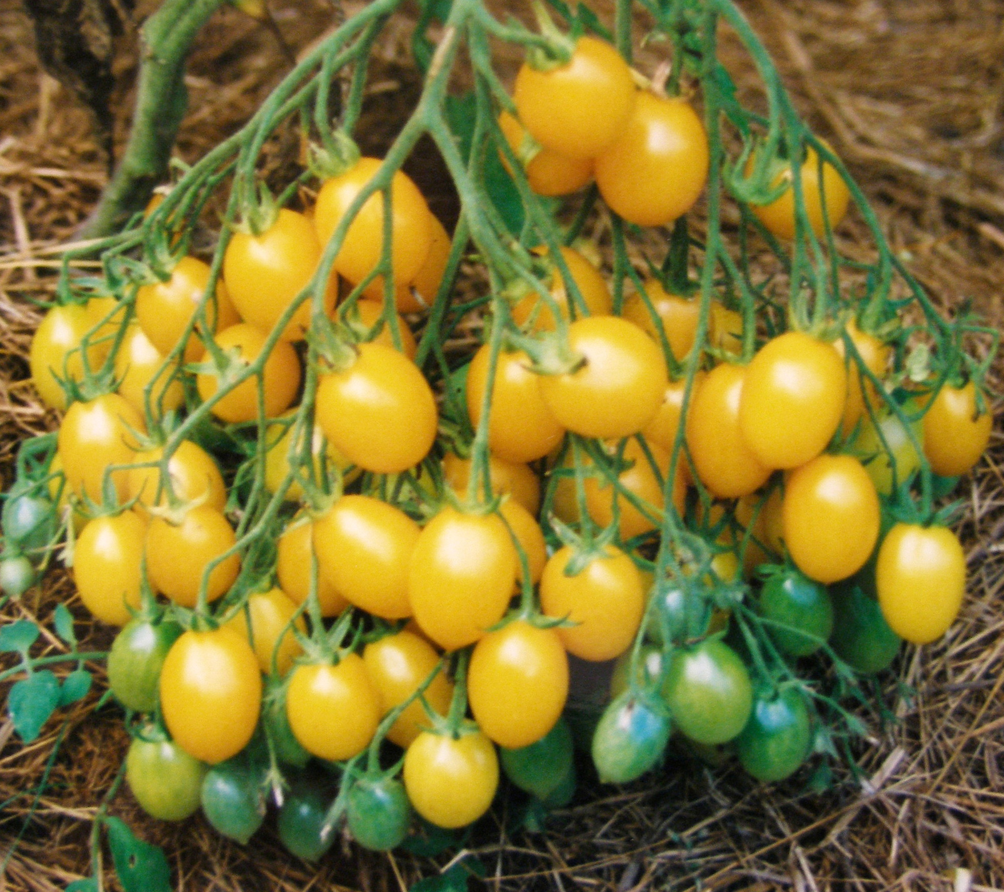 Ofattbart givande gul körsbärstomat med dadel-droppformade frukter. Denna gamla tyska sort är högväxande och måste bindas upp och tjuvas. Varje klase ger minst 50 st, 4 cm långa, gula, goda 15 g-frukter. Rekordet hittils är kring 1200 frukter på en planta. Gelbe Dattelwein trivs bäst i växthus, men kan ge bra i varma lägen utomhus. Sorten finns dokumenterad ända sedan 1750-talet.