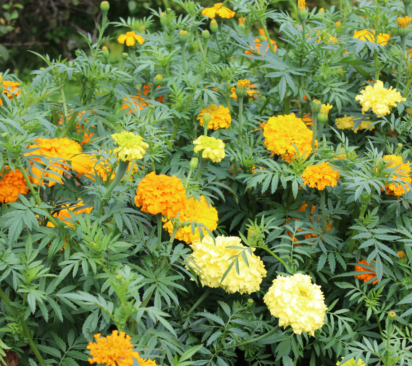 Tagetes erecta. Mycket stora fyllda och halvfyllda blommor i gult-orange på 75 cm höga stjälkar.