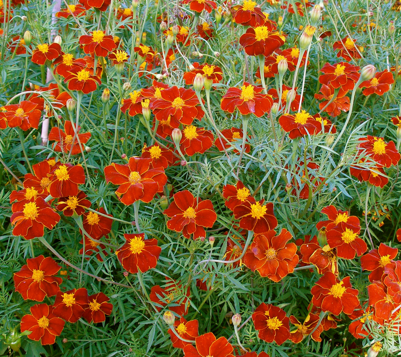 Tagetes erecta. (T. patula enl. vissa källor). En gammal Tagetes, som kommer från Linnés trädgård. Blommorna är ursprungligen mörkt sammetsröda, enkla och sitter fritt ovan det sirliga bladverket. På senare år har fler och fler orange och tvåfärgade blommor dykt upp. Så vi selekterar nu för att behålla den mörkröda varianten. Plantan blir 50-70 cm hög och ger ett gracilt, lite spretigt intryck, långt ifrån de moderna, kompakta, överdådigt blommande varianterna. Mycket vacker i en egen kruka. Linné-tagetesen är frisk och tålig och blommar under lång tid.