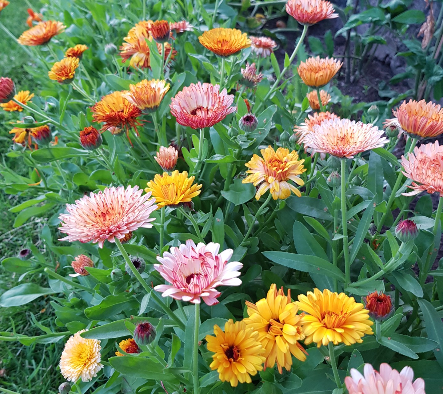 Blandning av enkla och halvfyllda blommor i orange, gult, rosa och kräm med mörkoranga kanter på kronbladen och mörk mitt. Höjd 50 cm.