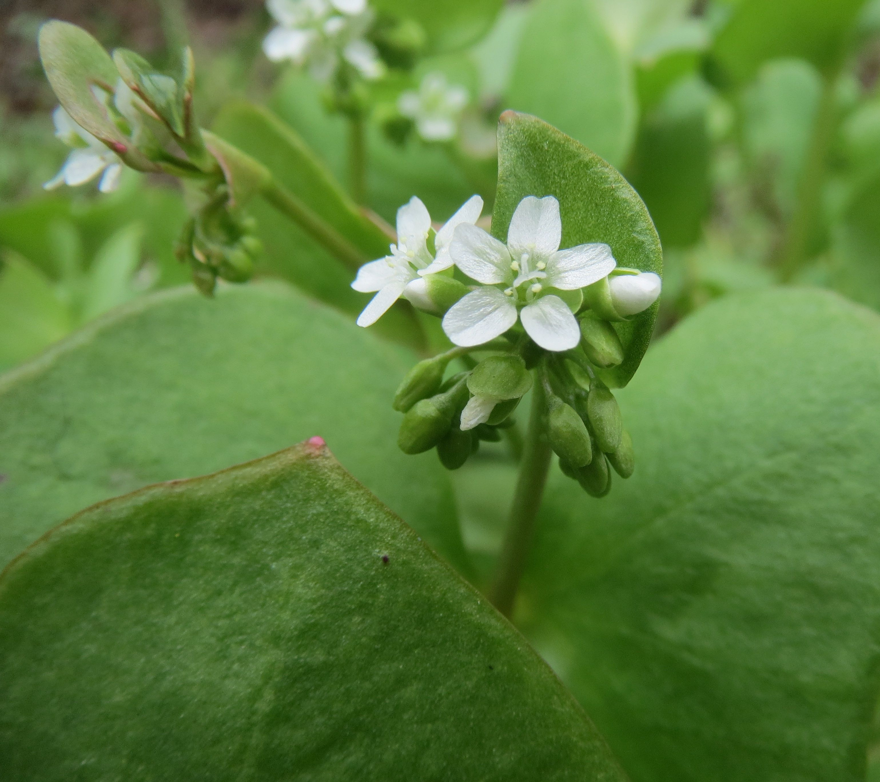 Claytonia perfoliata. Ettårig ört i Portulakfamiljen. Den härstammar från den Nordamerikanska kontinenten och har ingått i sallader eller använts som spenat så länge man minns.