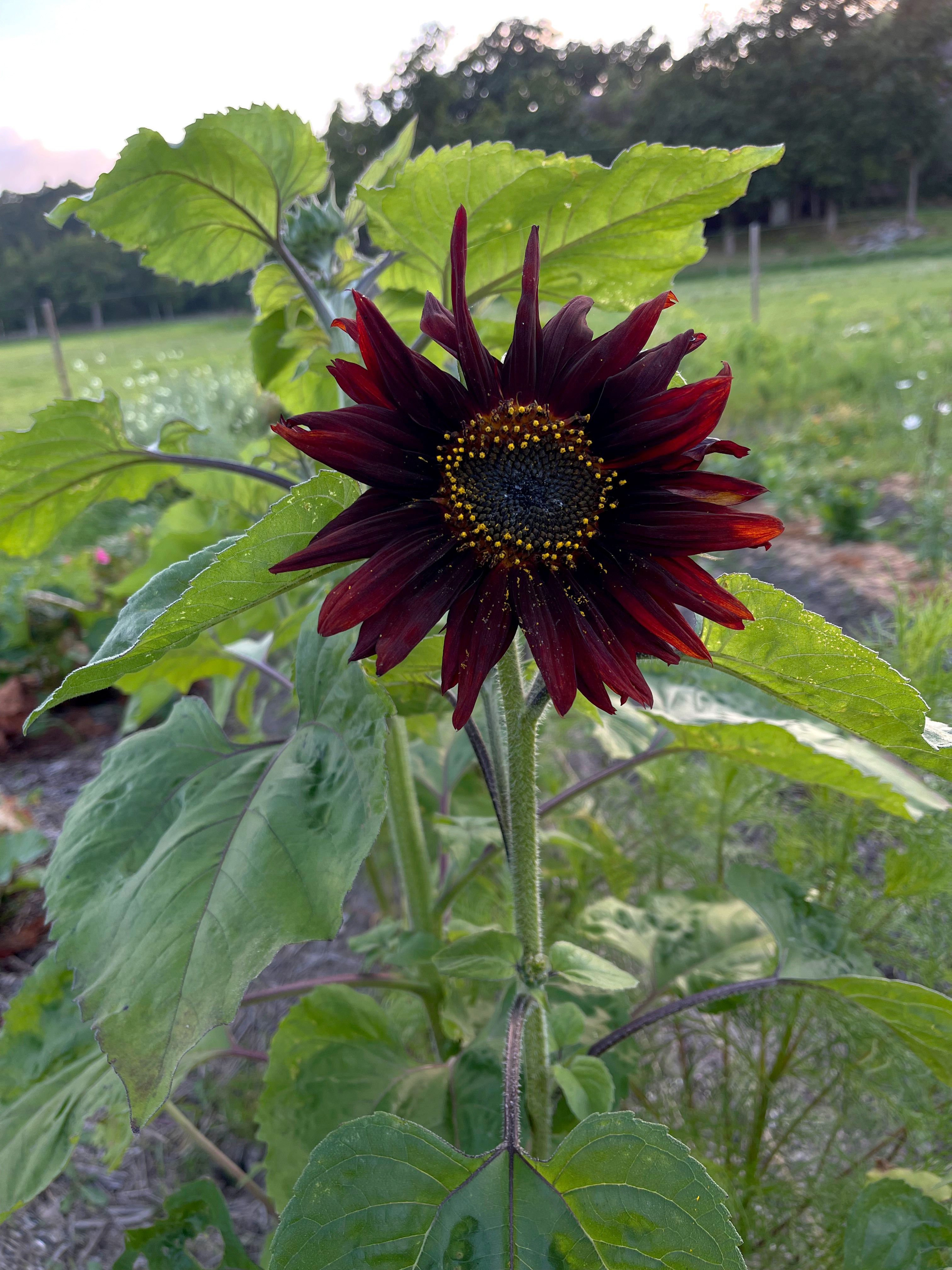 Mörkt roströd solros på medelhöga stjälkar. Velvet Queen grenar sig vid basen och ger flera blommor på varje planta. Fin snittblomma.