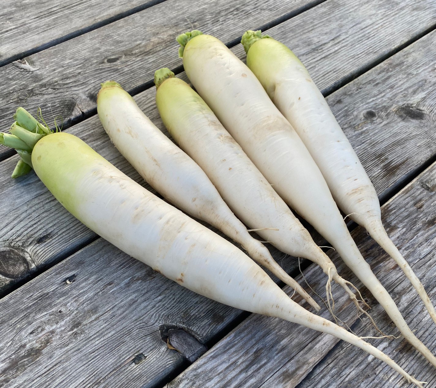Skörda så snart de nått ätbar storlek. Rötter som ska lagras skördas sent på hösten och behandlas som morötter. Daikon tål en del frost, men måste tina upp ordentligt innan skörd.Rötter som gått i blom efter en för tidig sådd är inte förlorade. Tvärtom. Fröbaljorna som bildas är tjocka och knubbiga och mycket kryddigt goda. Färska eller tillagade.