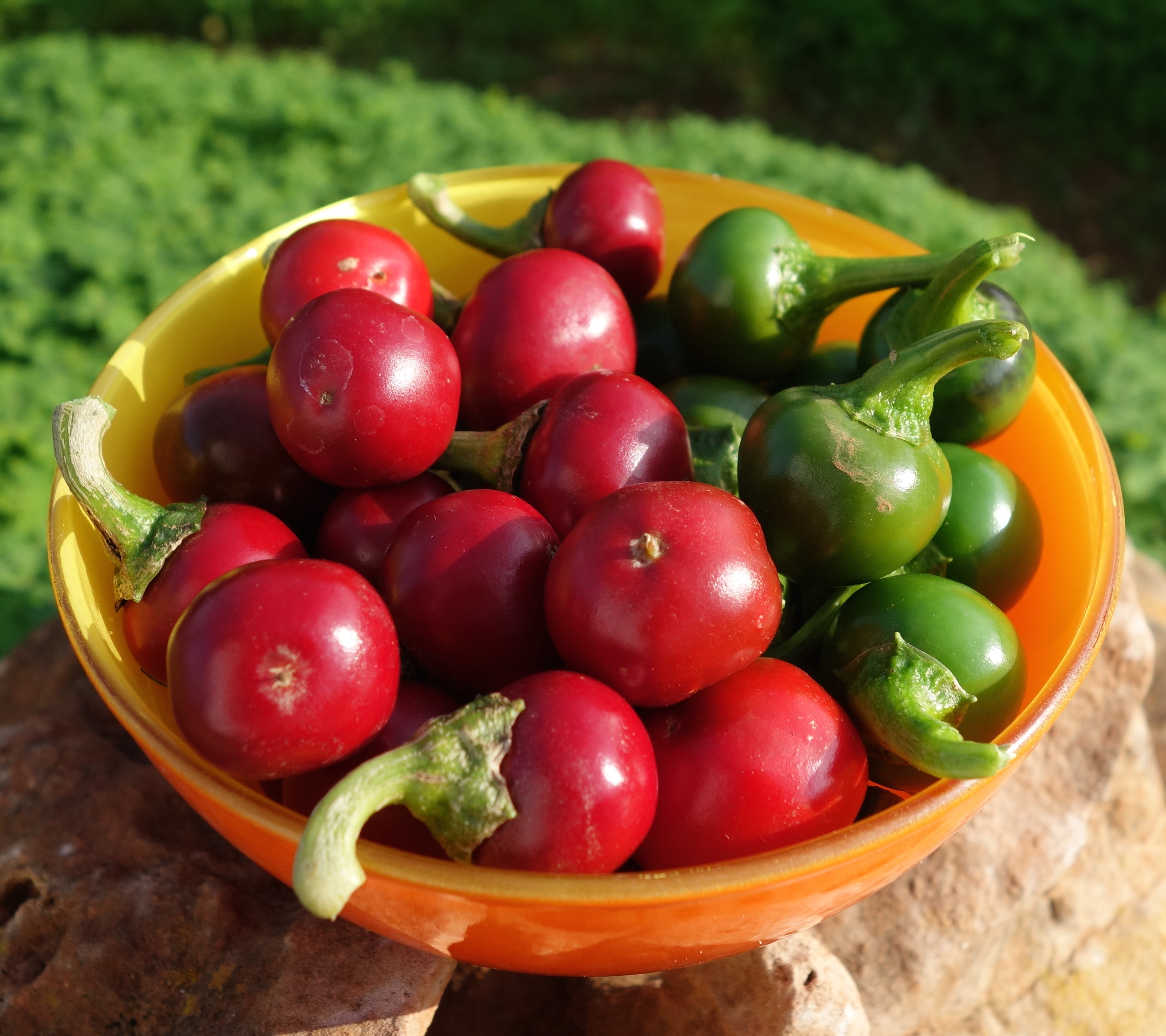 Frukterna skördas ibland gröna, men är inte helt mogna förrän färgen skiftat till rött. Eller till gult, orange och brunt för en del sorter. Plantan sätter ny frukt så länge den skördas.Chilipeppar kan också skördas omogen, men utvecklar sin smak alltmer ju mognare den blir. Även sol och värme är viktigt för att få en riktigt stark chilipeppar.