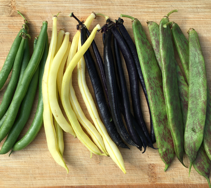 En blandning av låga bönor med baljor i grönt, gult, violett och röd-violettfläckigt. Skörda olika sorter och servera en palett med variation i färg och smak på samma gång.