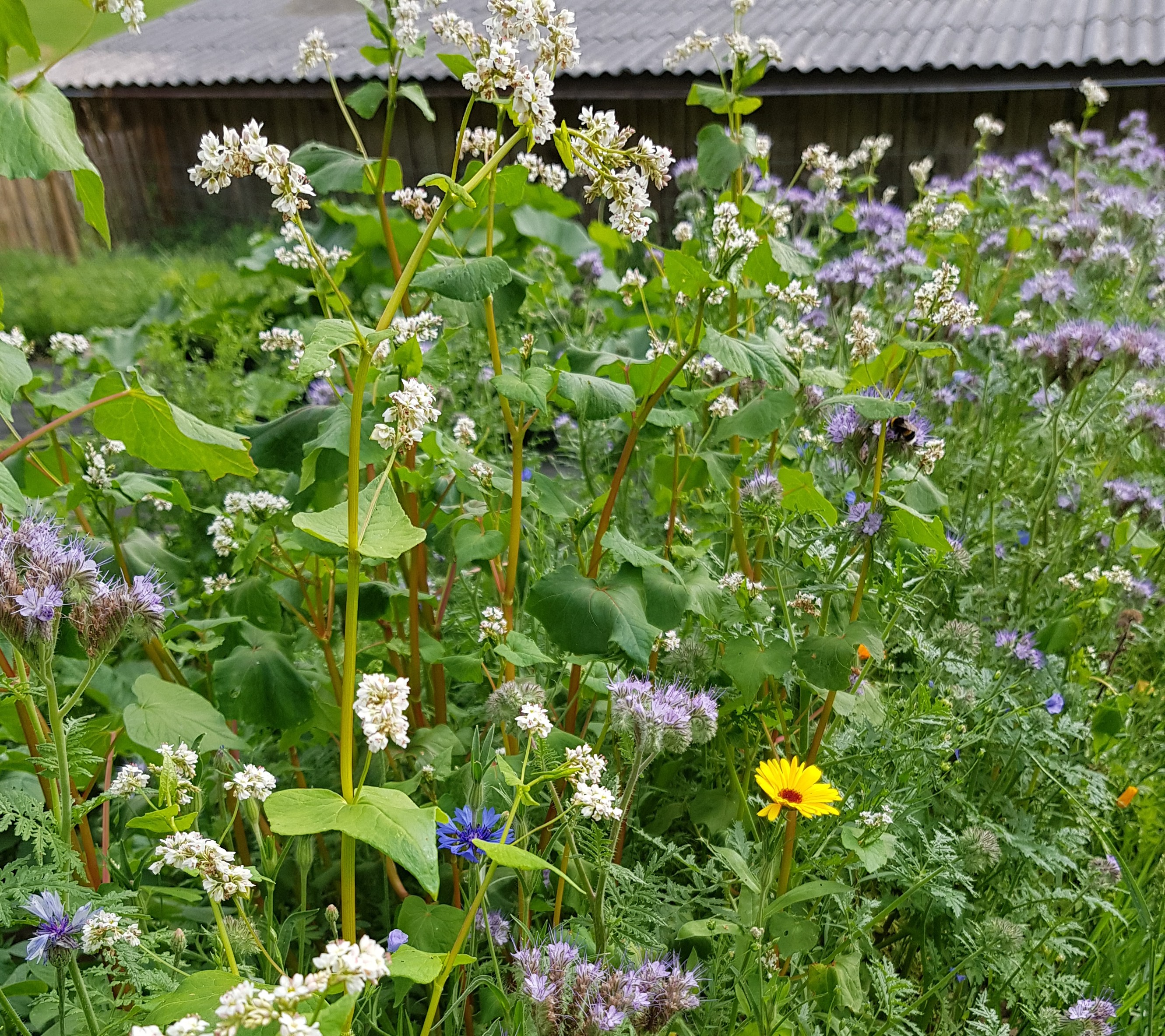 Blandningen innehåller: Lin, Facelia, Ringblomma, Bovete, Rödmalva, Vallmo, Klätt, Klint, Gurkört, Blomsterlin, Gullskära, Dill m fl.
