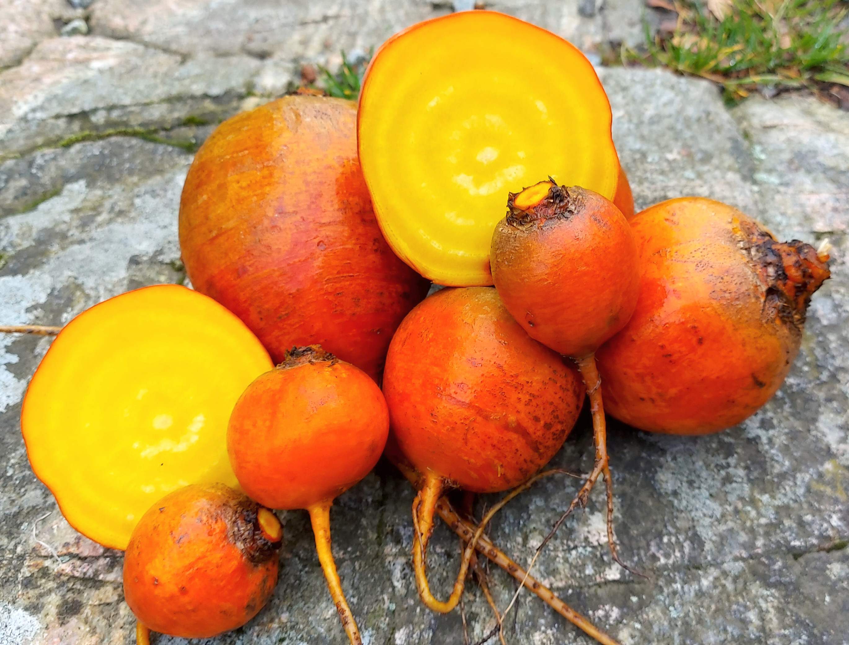 Gulbeta. En vinnare i våra smaktester. Som namnet antyder lyser den upp varje måltid under vintern liksom resten av året. Det är en medelstor orangegul beta med ett delikat gult kött med svaga ljusare ringar. Bladen är medelgröna och upprättväxande. Wintersonne trivs lika bra i lerjordar som i lättare jordar och håller sig utmärkt i lagret. Roten behåller sin fina färg efter kokning.